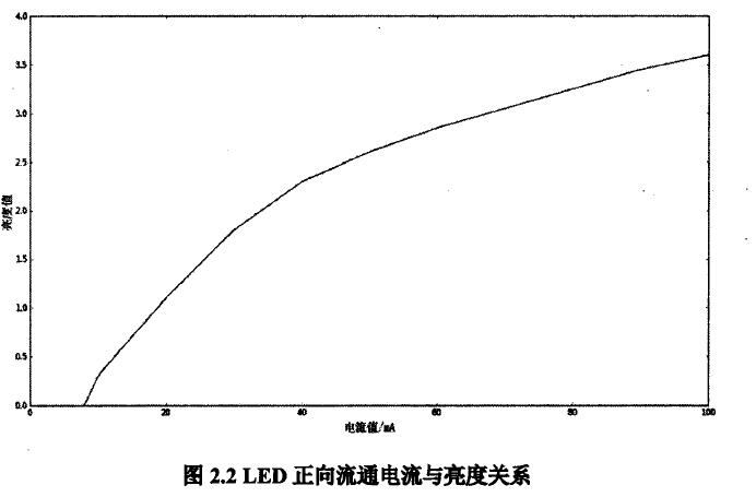 當(dāng)在LED加上正向電壓之后,PN結(jié)導(dǎo)通,LED發(fā)光。除了某些紅色LED 有飽和現(xiàn)象之外,LED的亮度基本與流過(guò)其電流的大小正比,圖2.2為某廠家生 產(chǎn)的紅色LED電流與亮度曲線(xiàn)圖心10]。