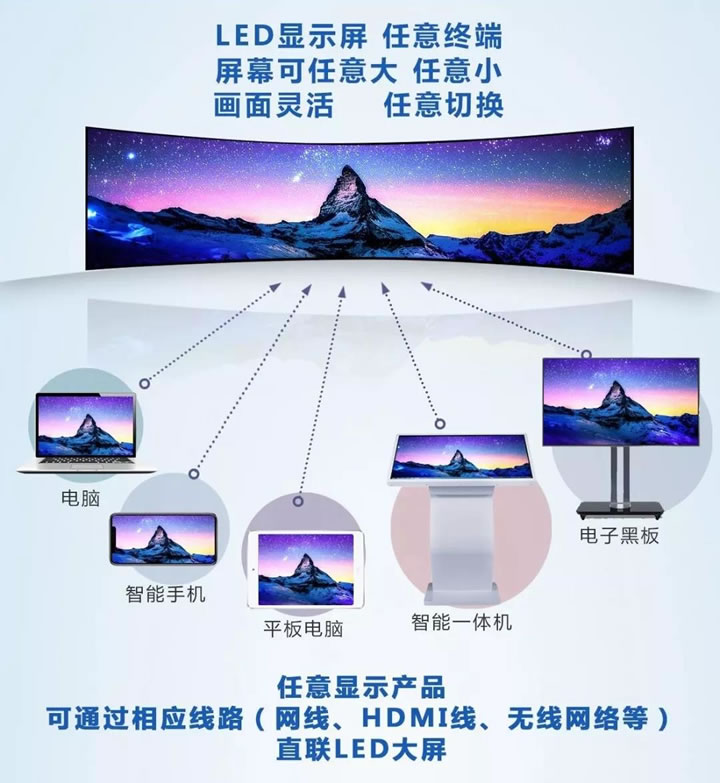 任意終端可通過(guò)相應(yīng)線路(網(wǎng)絡(luò)、HDMI線、無(wú)線網(wǎng)絡(luò)等)直連LED大屏,實(shí)現(xiàn)小屏大屏同步互聯(lián),通過(guò)小屏控制大屏,釋放更多靈活性與操作性。